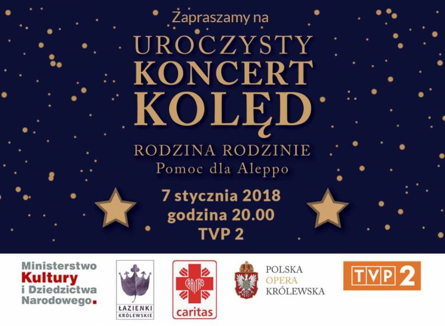 W niedzielę 7 stycznia 2018 r. o godzinie 20.00 w Drugim Programie Telewizji Polskiej transmitowany będzie na żywo Charytatywny Koncert Kolęd „Rodzina Rodzinie. Pomoc dla Aleppo” w wykonaniu Polskiej Opery Królewskiej. Organizatorami inicjatywy są Ministerstwo Kultury i Dziedzictwa Narodowego, Telewizja Polska i Caritas Polska.