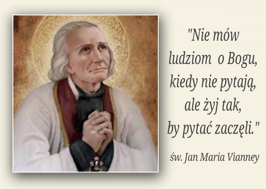Dziś w Kościele katolickim wspominamy świętego Jana Marię Vianneya prezbitera. Urodził się 8 maja 1786 r. Wstąpił do niższego seminarium duchownego w 1812 r. Przy słabym przygotowaniu i późnym wieku nauka szła mu bardzo ciężko. 13 sierpnia 1815 roku Jan otrzymał święcenia kapłańskie. Miał wówczas 29 lat. Po trzech latach biskup wysłał Jana jako wikariusza-kapelana do Ars-en-Dembes. Młody kapłan zastał kościółek zaniedbany i opustoszały. Obojętność religijna była tak wielka, że na Mszy świętej niedzielnej było kilka osób. Nie wiedział, że przyjdzie mu tu pozostać przez 41 lat (1818-1859). Całe godziny przebywał na modlitwie przed Najświętszym Sakramentem. W dziesiątym roku pasterzowania przybyło do Ars ok. 20 000 ludzi. W ostatnim roku swojego życia miał przy konfesjonale ich ok. 80 000. Nadmierne pokuty osłabiły już i tak wyczerpany organizm. Jako męczennik cierpiący za grzeszników i ofiara konfesjonału, zmarł 4 sierpnia 1859 r., przeżywszy 73 lata.