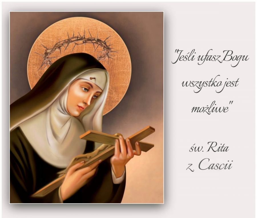 Święta Rita urodziła się prawdopodobnie w 1381 r. w Roccaporenie w gminie Cascia we Włoszech. Była jedynaczką i bezproblemowym dzieckiem. Od najmłodszych lat wierzyła, że najpiękniejszą duszą jest jedynie dusza ufająca Bogu. Na prośbę rodziców trwała w dość nieszczęśliwym małżeństwie. Jednak ostatecznie jej mąż zginął w wyniku porachunków dwóch rodów. Przed śmiercią prosił o wybaczenie ją i cały Kościół. Synowie świętej Rity jednak chcieli pomścić śmierć ojca, zgodnie z panującym na tych terenach prawem wendety. Rita modliła się, by – jeśli mają kogoś zabić – zmarli, nie doczekawszy dorosłości. Rok później zmarli podczas epidemii czerwonki (choroba zakaźna jelit). Mając ponad trzydzieści lat, nie umiejąc pisać ani czytać, Rita chciała wstąpić do zakonu. Przyjęto ją zatem do chóru sióstr wykonujących codzienne obowiązki w klasztorze. Rita z ufnością i radością spełniała wszystko, co jej wyznaczono. Była całkowicie oddana swojej posłudze. Inne siostry nie raz widziały, jak zapłakana leży krzyżem, odmawiając nabożeństwo do Bożej Męki. Zapragnęła, by mogła doświadczyć sama choć części cierpień Jezusa. Tak też się stało. Bóg dał jej łaskę cierpień Swojej męki w postaci rany od korony cierniowej na czole. Rita miała ten stygmat już do końca życia. Rita jest jedną z niewielu świętych, która wyróżniała się tak wielką pokorą. Za życia praktycznie mało kto wiedział o jej istnieniu (poza rodziną i zamkniętym klasztorem, w którym żyła). W klasztorze św. Marii Magdaleny w Cascii spędziła resztę życia. Wykonując najprostsze czynności, osiągała szczyty kontemplacji. Bóg powołał ją do siebie 22 maja 1457 r. Zmarła na gruźlicę. Została pochowana w kościele w Cascii. Miejsce jej pochówku prawie od razu zaczęło przyciągać tłumy pielgrzymów. Nie bez powodu – przy jej grobie działy się cuda, których nikt nie potrafił racjonalnie wytłumaczyć. Po kilku latach od jej pochówku w kościele wybuchł pożar i wszystko zostało zniszczone. Jej trumna jednak pozostała nietknięta. Jej kult zaczął się szerzyć. Podczas kanonizacji w 1900 r. papież Leon XIII nazwał ją drogocenną perłą Umbrii.