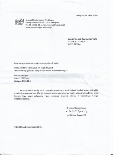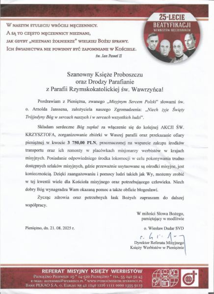 Otrzymaliśmy podziękowania od Ojców Misjonarzy Zgromadzenia Słowa Bożego czyli Werbistów za wsparcie finansowe z Akcji św. Krzysztof, które przeznaczone będą na zakup środków transportu potrzebnego Misjonarzom i Misjonarkom. Konkretnie środki przeznaczone są na misję o. Marka Glodka SVD posługującego w Zimbabwe w miejscowości Dlamini.