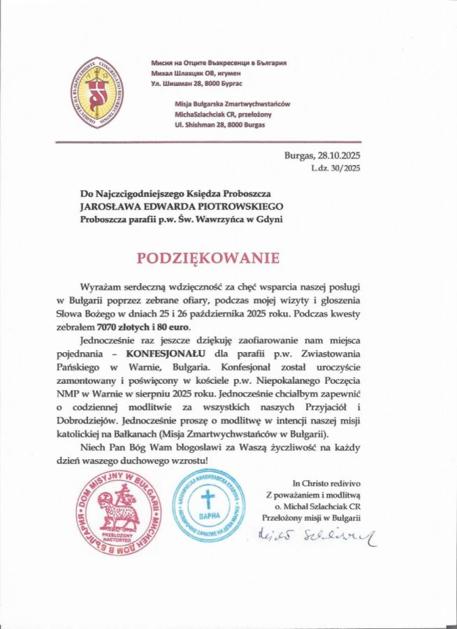 Podziękowania o. Michała Szlachciaka CR za ofiary na rzecz Misji Bułgarskiej Zmartwychwstańców zebranych 26.10.2026 r. w Parafii św. Wawrzyńca w Gdyni Wielkim Kacku.