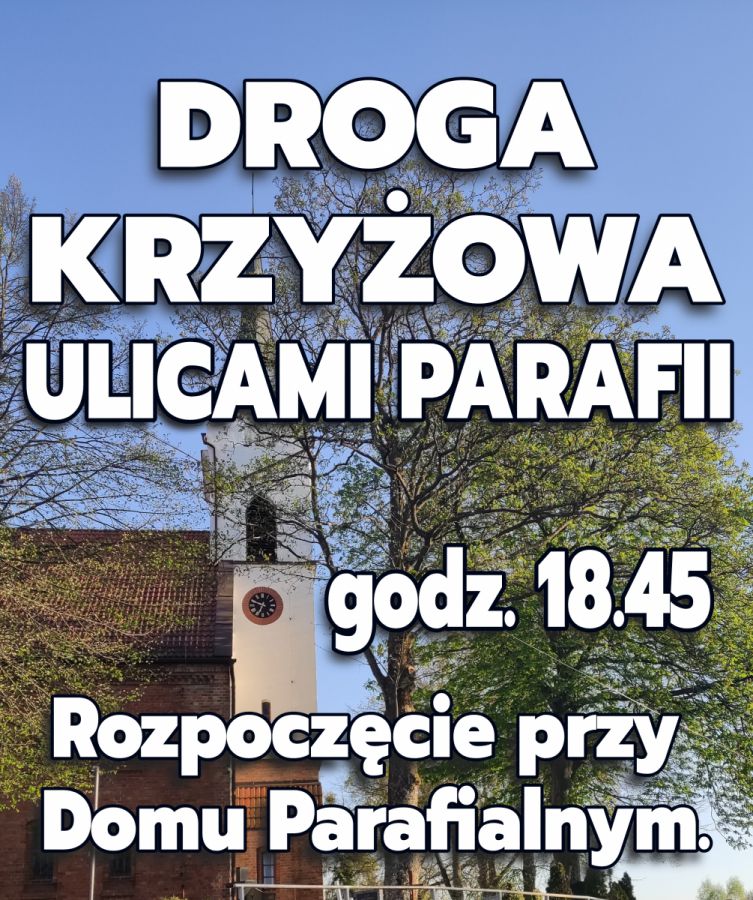 W najbliższy piątek 24 marca zapraszamy na Drogę Krzyżową ulicami naszej parafii. Rozpoczęcie o godzinie 18.45 przy Domu Parafialnym. W związku z tym nie będzie Drogi Krzyżowej w kościele dla Dzieci o 17.30 i o godzinie 18.30 dla Młodzieży i Dorosłych.