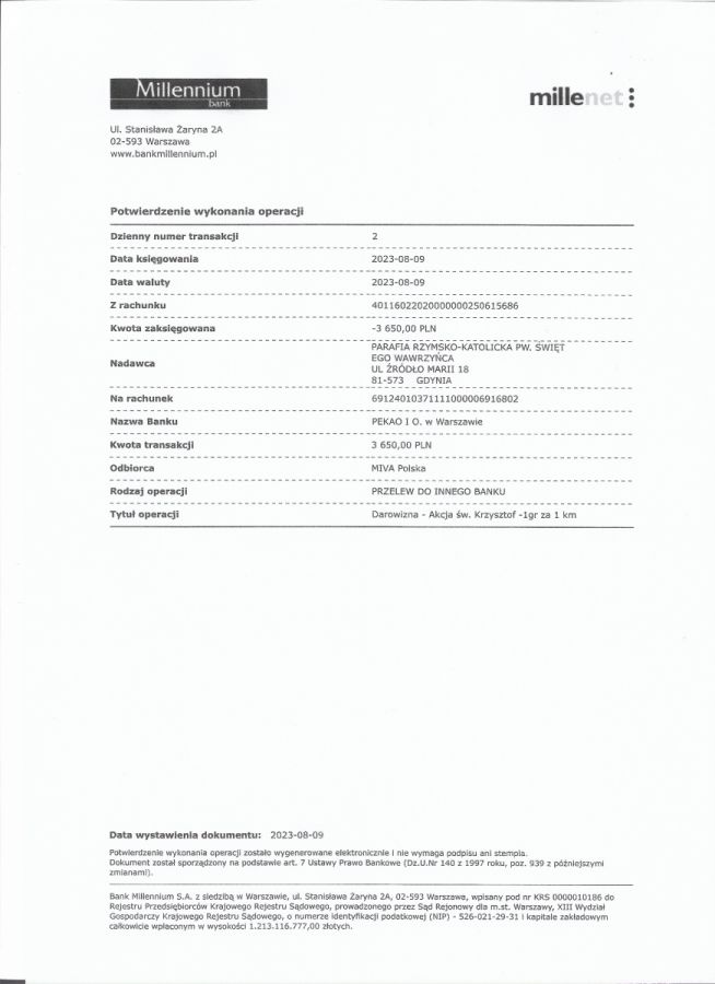 W niedzielę 30 lipca br. podczas błogosłwwieństwa pojazdów była zebrana kwesta na Akcję św. Krzysztof, podczas której zebraliśmy 3650 PLN. Pieniądze zostały przekazane MIVA Polska, która zaopatruje misje i misjonarzy w różnego rodzaju środki transportu, Bóg zapłać za dar serca!