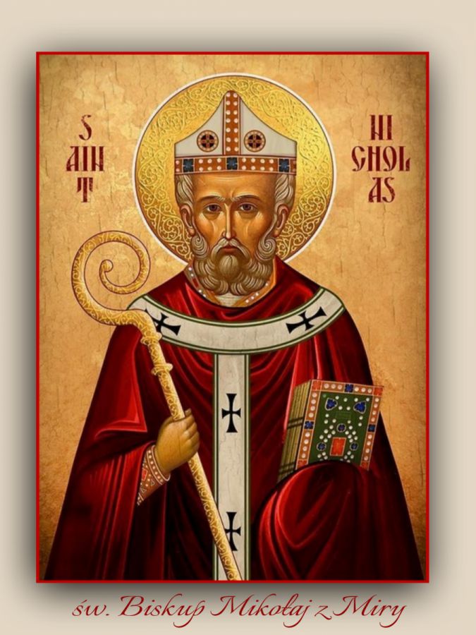 Święty Mikołaj urodził się około roku 270 w mieście Patara w Azji Mniejszej, jako jedyne, wymodlone dziecko swoich rodziców. Od najmłodszych lat był bardzo wrażliwy na ludzką biedę i cierpienie oraz niezwykle pobożny. Gdy został wybrany na biskupa Miry swoją pomocą obdarzał wszystkich potrzebujących, korzystając przy tym ze swego rodzinnego majątku. Tradycja opowiada o wielu dziełach, które uczynił w swoim życiu, a które przyniosły mu tytuł patrona bezinteresownej dobroci. Między innymi popularna jest opowieść o trzech pannach, córkach zubożałego szlachcica, którym biskup pod osłoną nocy przekazał posag umożliwiając im tym samym wyjście za mąż i założenie rodzin. Często również okazywał ogromne miłosierdzie w stosunku do więźniów i dzięki jego wstawiennictwu u władz cesarskich wielu z nich odzyskało wolność. Podczas panowania cesarza Dioklecjana, które przypadło na lata 284-305, został uwięziony i dopiero edykt mediolański cesarza Konstantyna, wydany w roku 313, przywrócił mu wolność. Uczestniczył w soborze nicejskim w roku 325, kiedy to została potępiona herezja ariańska. Zmarł 6 grudnia około roku 350 i został pochowany w Mirze.